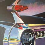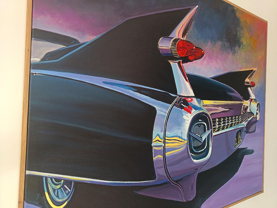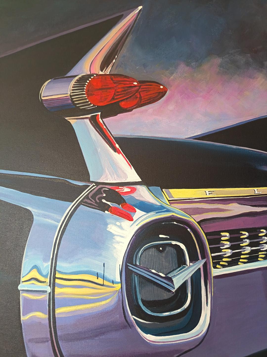 Cette œuvre originale met en lumière l’arrière emblématique d’une Cadillac bleue, où les ailerons spectaculaires et les lignes audacieuses deviennent une véritable signature visuelle. Symbole fort du design automobile américain, le véhicule est ici transformé en objet artistique, entre puissance et élégance. Le cadrage met en valeur la structure graphique et l’équilibre des formes, offrant une lecture à la fois esthétique et immersive.