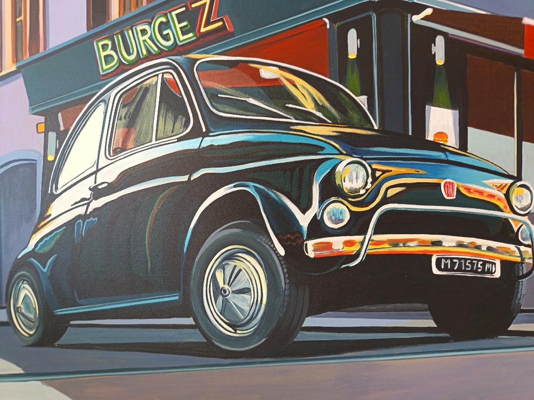 Cette œuvre originale capture une scène de vie urbaine empreinte de douceur et de nostalgie, où l’atmosphère évoque une certaine idée de la dolce vita. La présence d’un véhicule vintage et d’une architecture animée crée une composition équilibrée, entre mouvement et tranquillité. Le cadrage met en valeur la profondeur de l’espace et invite le regard à circuler dans l’image.