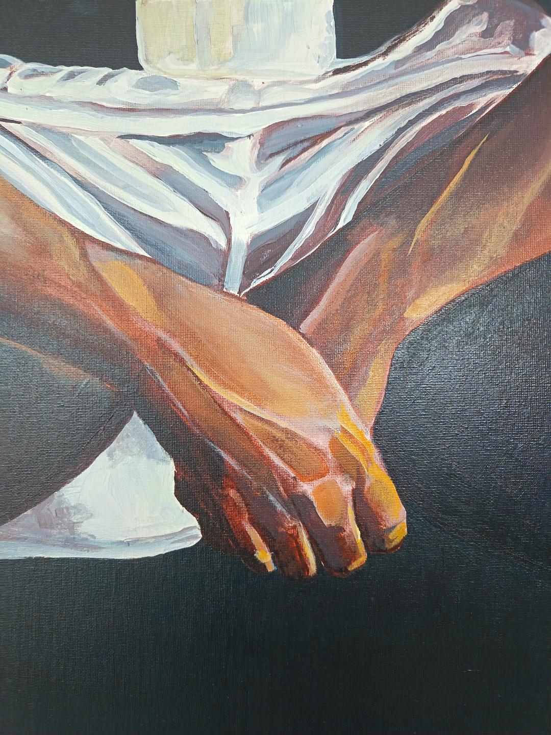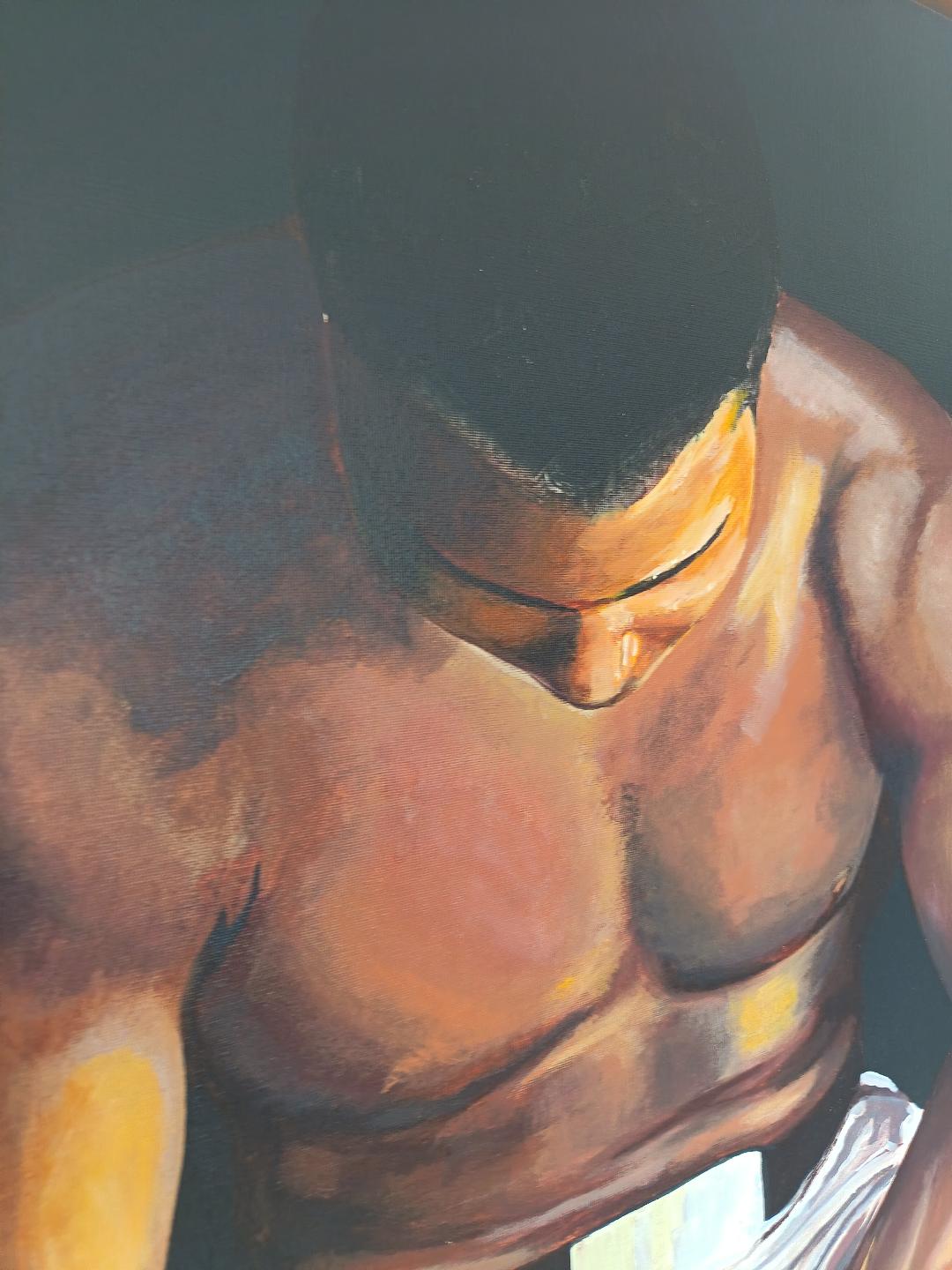 Cette œuvre originale s’inscrit dans une démarche de peinture contemporaine figurative, centrée sur la représentation du corps et de l’émotion. « Mr Ali » dévoile un portrait masculin capturé dans un moment d’introspection profonde, où la puissance physique se confronte à une forme de vulnérabilité intérieure. La posture du modèle, légèrement repliée, crée une tension subtile entre force et abandon, invitant le spectateur à une lecture intime et silencieuse.